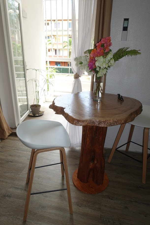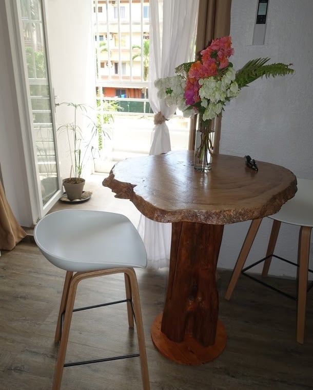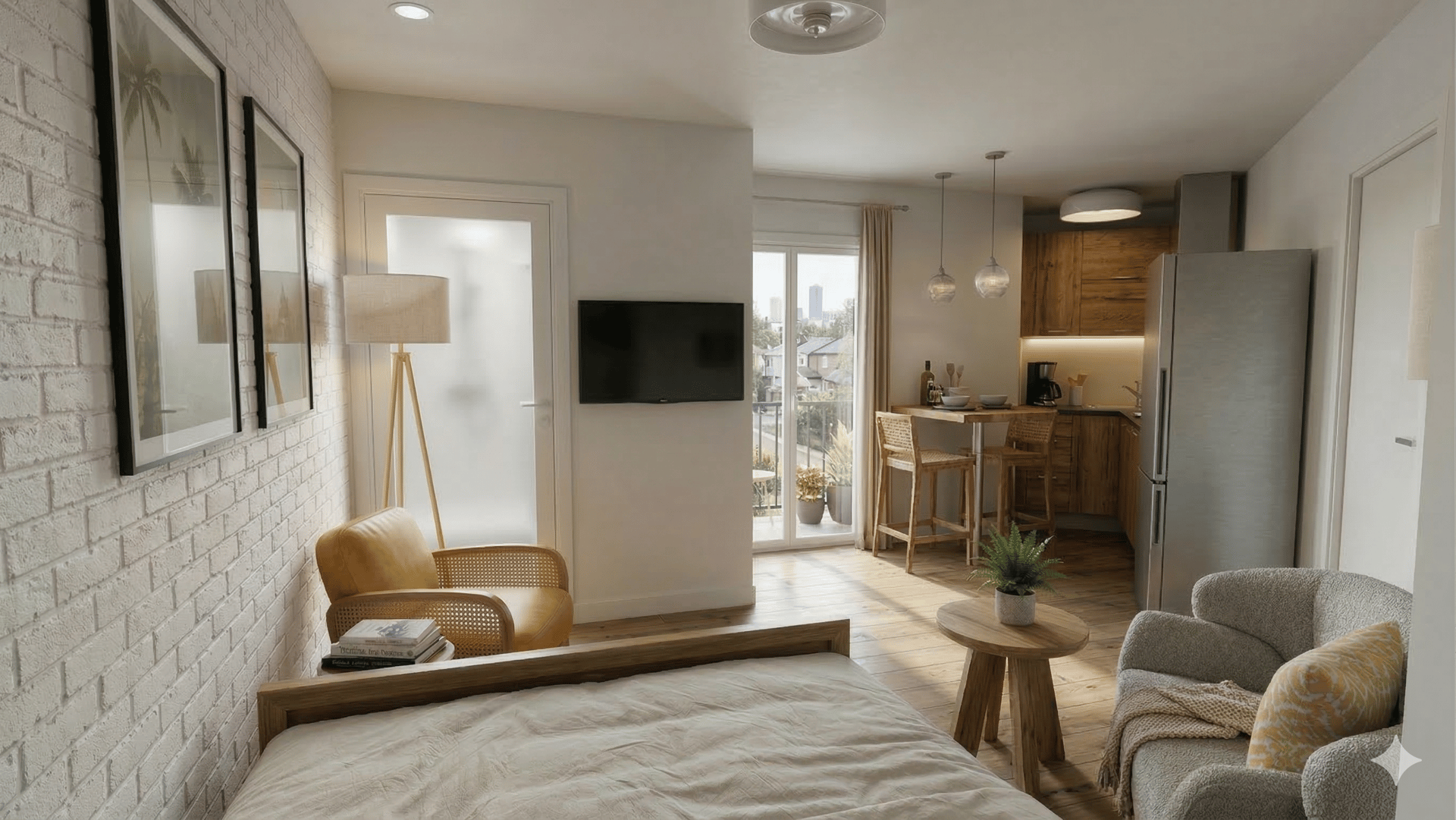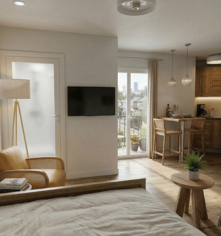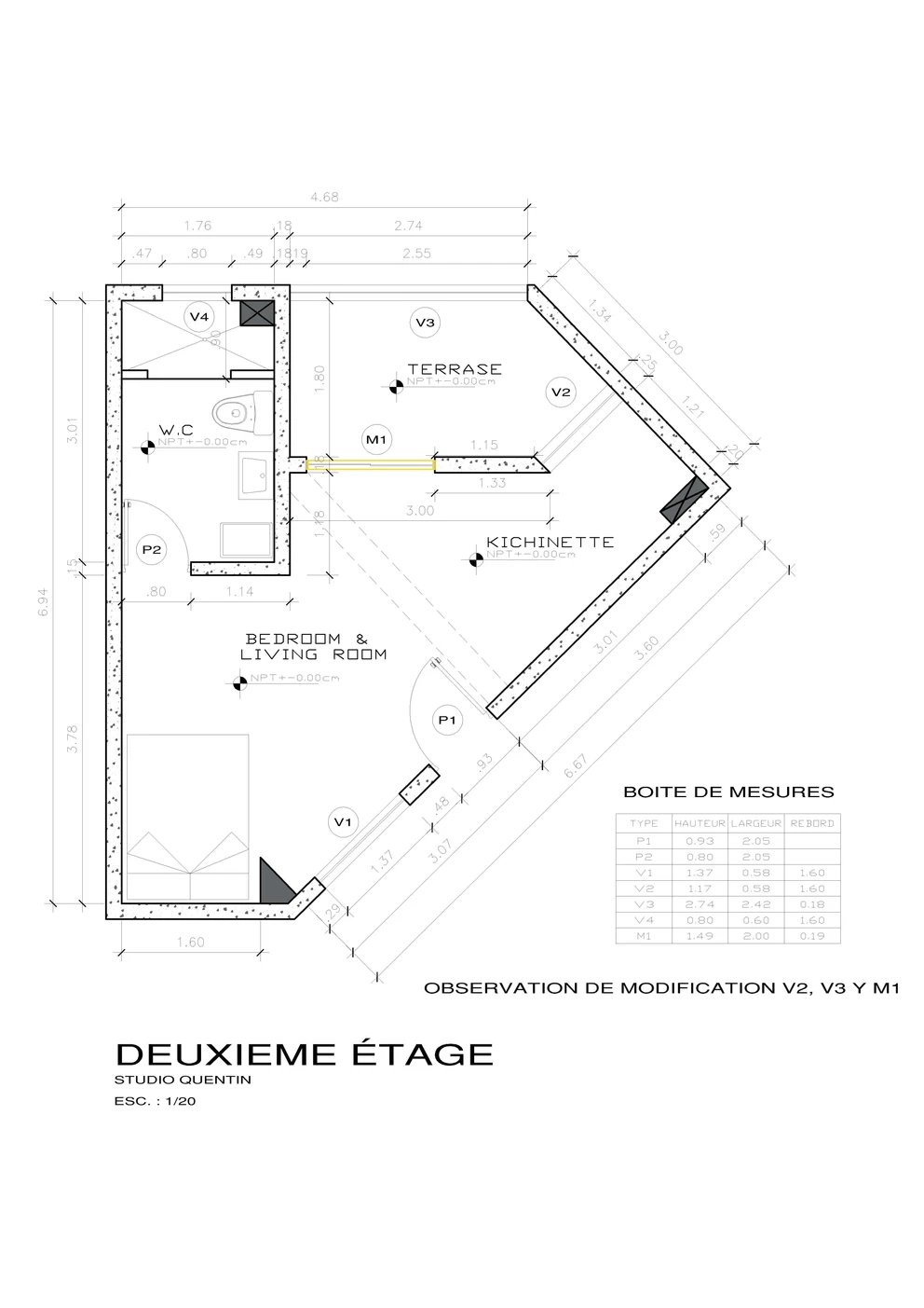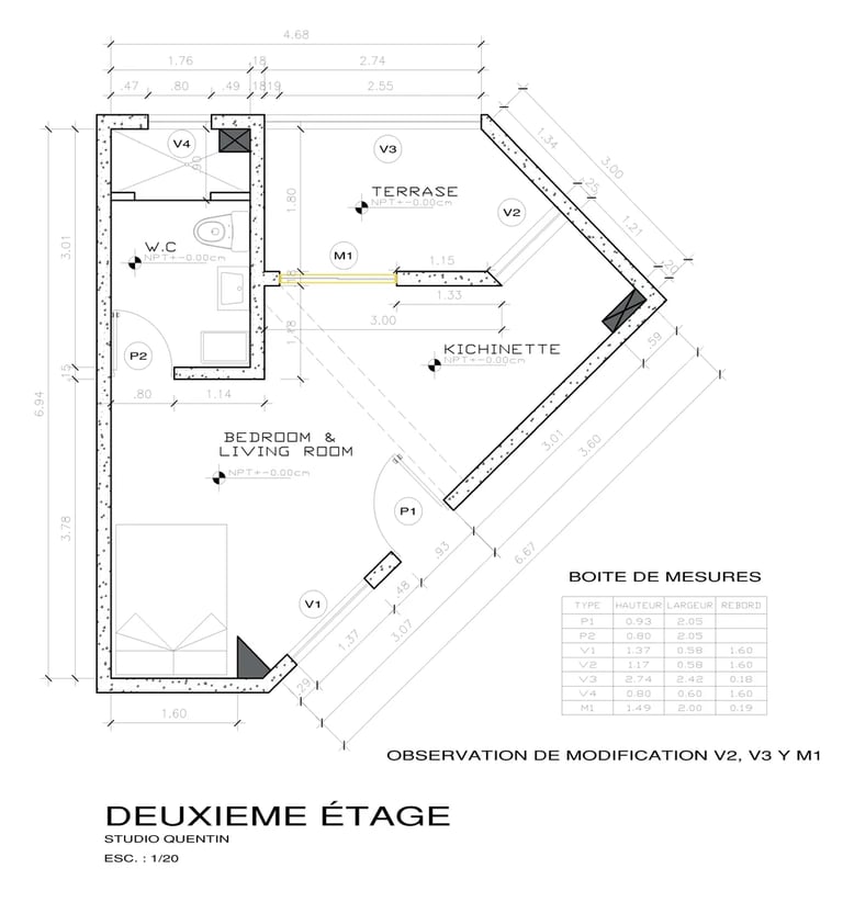 Modification complète d'un studio pour un budget de 15 000€ avec conception et création de pièces de mobilier uniques.